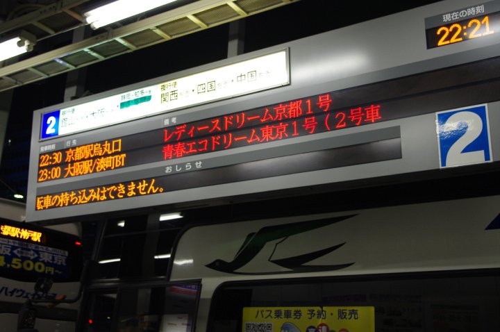 原先我地可以搭早一班(23:00) 車到達京都,但隨行有兩位男仕,所以我地唔可以book LADIES CAR. 我地book了2310巴士,車好準時到站,我地一行8人剛好坐哂係下層。唔怕我地大聲講0野嘈親其他乘客。座位都好闊落,仲提供拖鞋比每一位乘客。真係貼心!! 而我坐左一陣已經訓著左,而且好"臨"。其間有兩次停車開門,我都唔知呢!! 可想而知,座位都算唔錯啦。 睇返時間表,我地會係明早0641到達京都駅,好期待快D到呢!