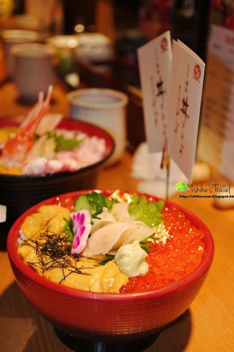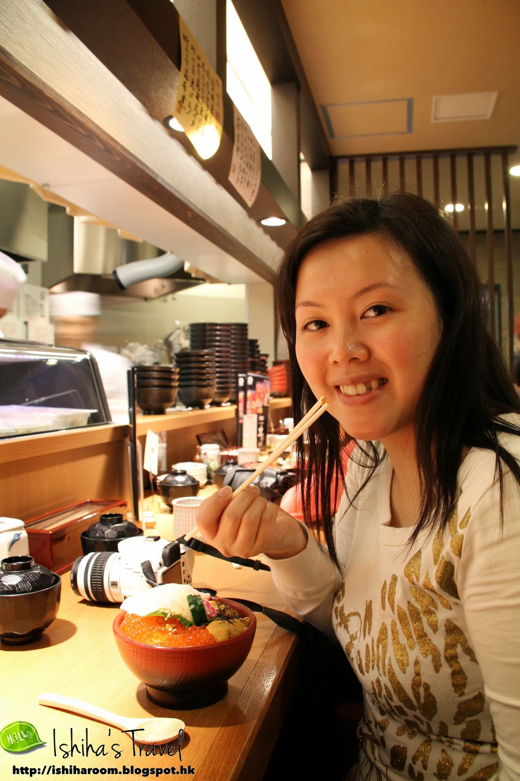 我們一行8人,其中有兩位也來過這裡好幾次,正想找回山さん寿司(http://www.yamasan-susi.com/page2.htm)那裡既海鮮丼係好好味,因位址係場外,靠記憶也找唔到。 唯有見到邊一間okay便上去試試。 因食lunch時間,人也夠多,我們也等了10分鐘才入座。 看見bar枱對住那幾個冰櫃算新鮮,於是我們各人點了一個海鮮丼,而我點了一碗海膽魚子海鮮丼,來到時賣相的確不錯,而且每碗也有加上金箔。 當我們很開心的試了幾口,大家都發覺out of our expectation!! 海鮮唔夠新鮮呢!! 更沒想到海膽味道唔太好。