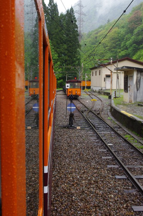 黑部峽谷車站對面係電氣紀念館。不過天雨關係,我地掛住避雨,沒有入內參觀。黑部峽谷終點是櫸平,全程要坐1小時 30分鐘,沿途會經過41條隧道及22座橋。沿線分佈著為宇奈月溫泉提供熱泉的黑薙溫泉、鍾釣溫泉、名劍溫泉等溫泉,可以中途下車(黑薙及鍾釣站)但記緊 要買單程票。 鍾釣溫泉很有名,因為在這裏的黑部川河灘的任何一個地方都可挖出溫泉,就地可挖造一個自己專用的臨時溫泉。