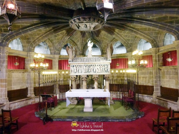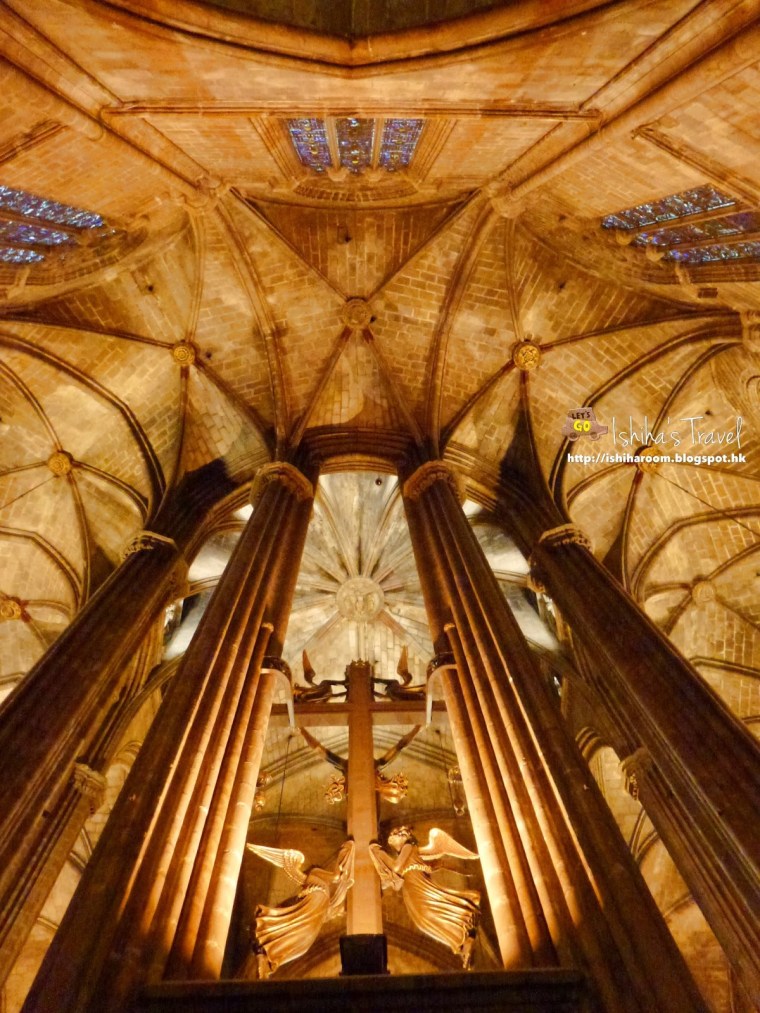 入到大教堂, 不要錯過主祭壇之下的地下聖堂, 裡面安置著巴塞隆那納守護聖女尤拉莉亞的石棺.