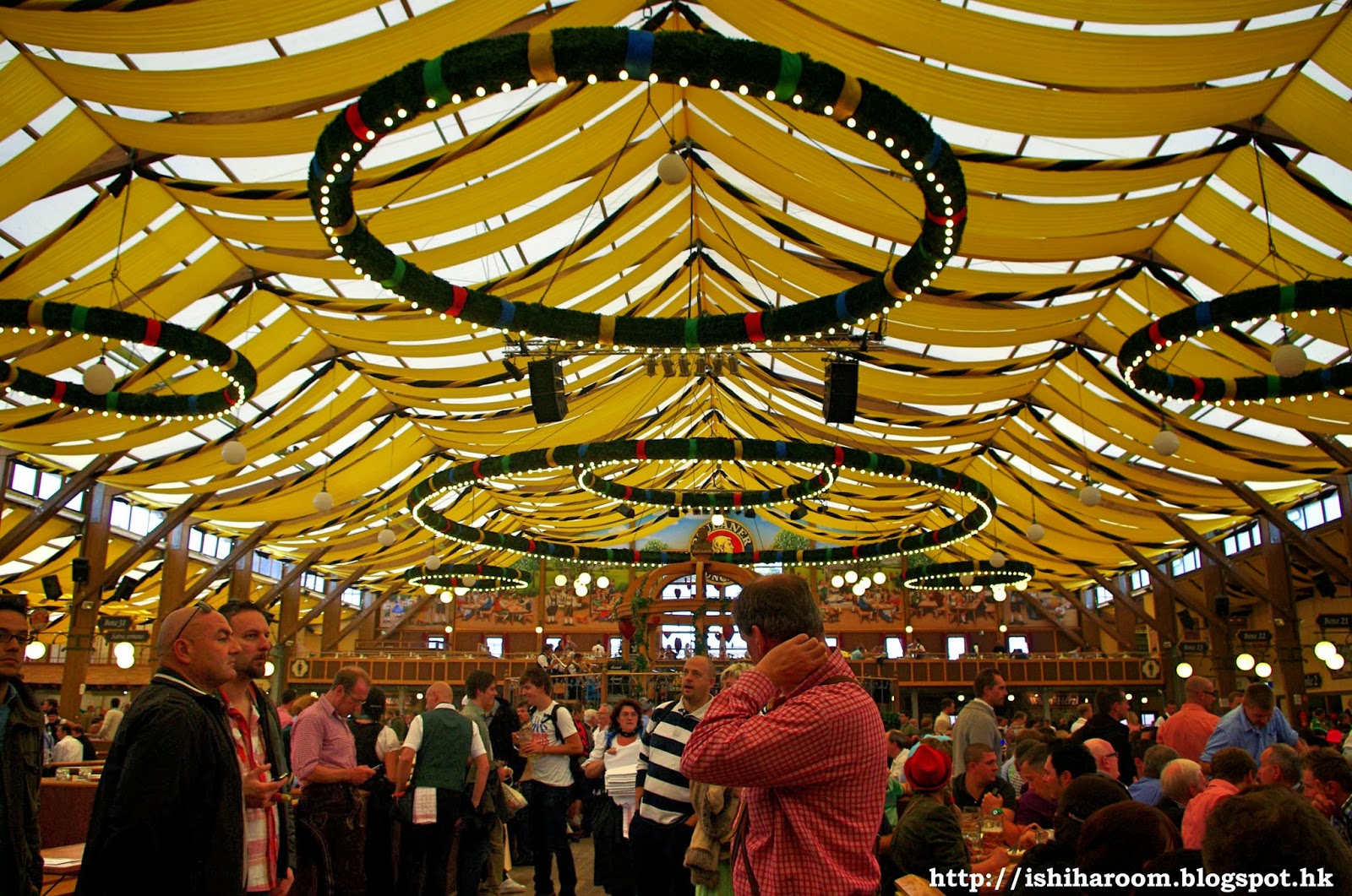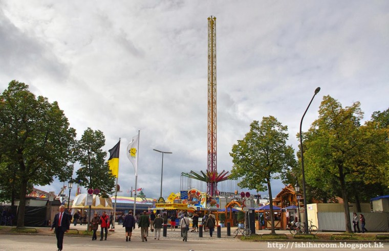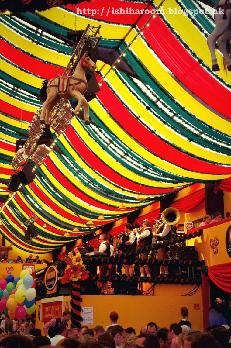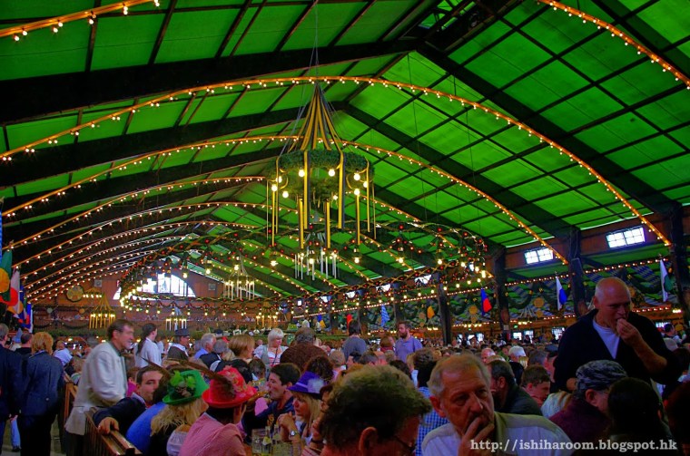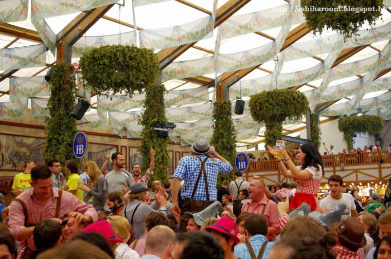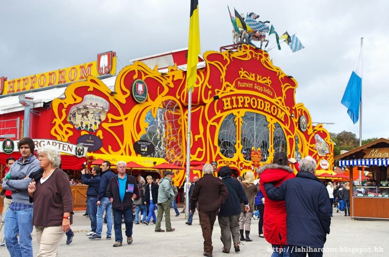 一出地鐵, 就會見到人潮向一個方向行走, 跟著走不遠便可到達啤酒節會場.  啤酒節,似乎不僅限於啤酒暢飲,其實Okotberfest傳統是全家群體出來玩的節慶,整個Theresienwiese就係一個大型遊樂園,從鬼屋、跳樓機到摩天輪,都會見到.入到去Theresienwiese隨處見到無論男女老少都係穿上傳統服裝. 首先我地去左Hippodrom入到去真的不得了, 人山人海.  想找一個位坐都沒有.  既然冇位, 都可以感受下現場氣氛.有live band.  樂隊會現場彈奏著, 周邊的人會起勢一起唱.