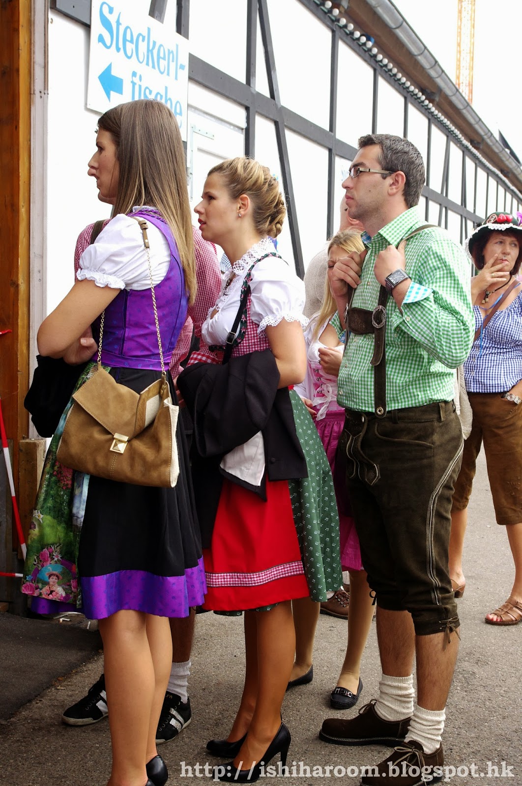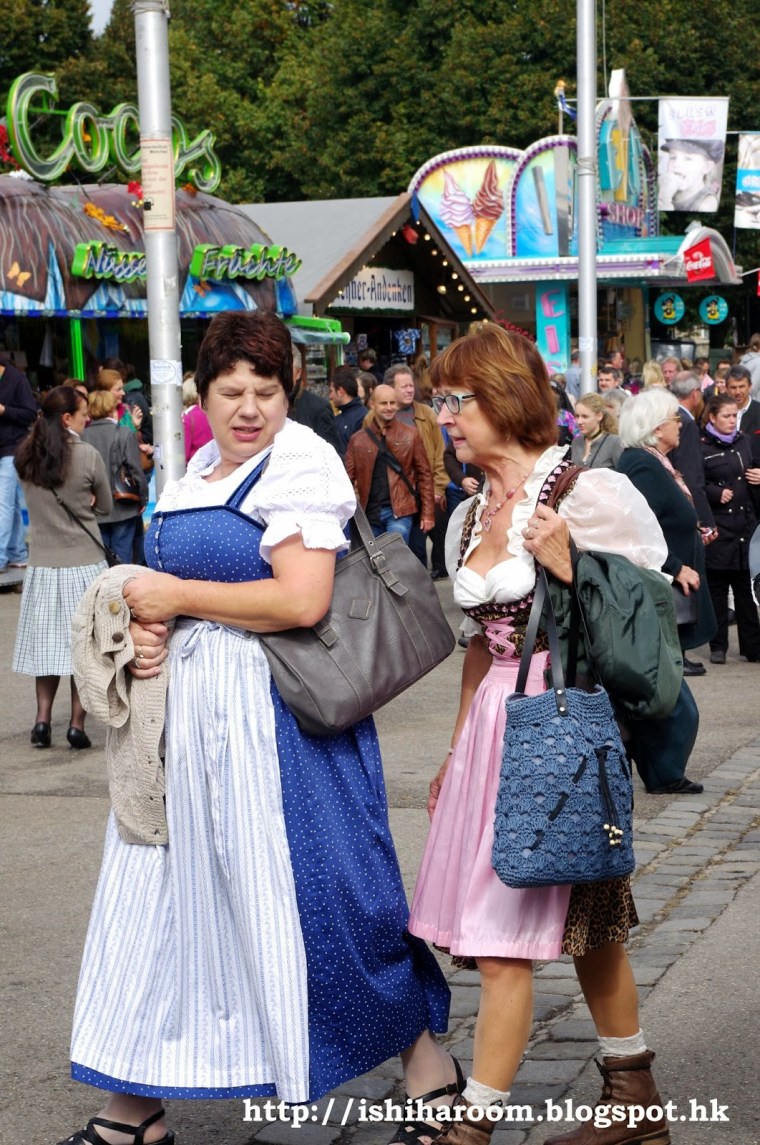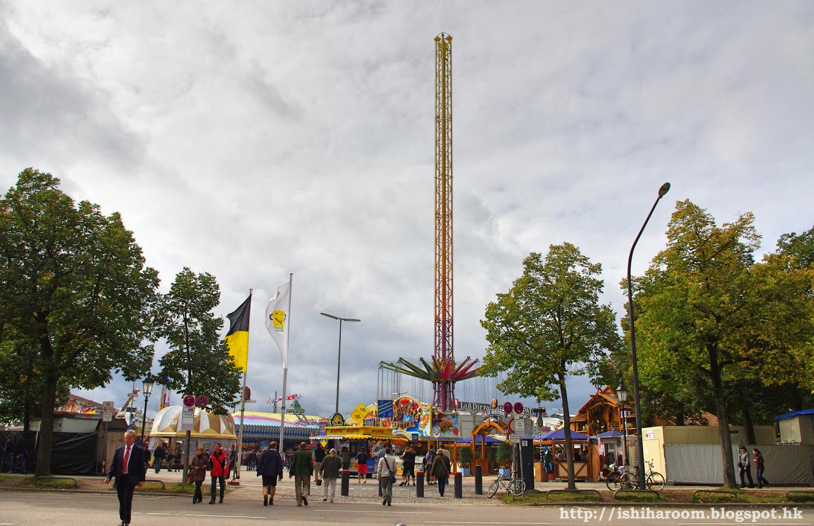 一出地鐵, 就會見到人潮向一個方向行走, 跟著走不遠便可到達啤酒節會場.  啤酒節,似乎不僅限於啤酒暢飲,其實Okotberfest傳統是全家群體出來玩的節慶,整個Theresienwiese就係一個大型遊樂園,從鬼屋、跳樓機到摩天輪,都會見到.入到去Theresienwiese隨處見到無論男女老少都係穿上傳統服裝. 首先我地去左Hippodrom入到去真的不得了, 人山人海.  想找一個位坐都沒有.  既然冇位, 都可以感受下現場氣氛.有live band.  樂隊會現場彈奏著, 周邊的人會起勢一起唱.