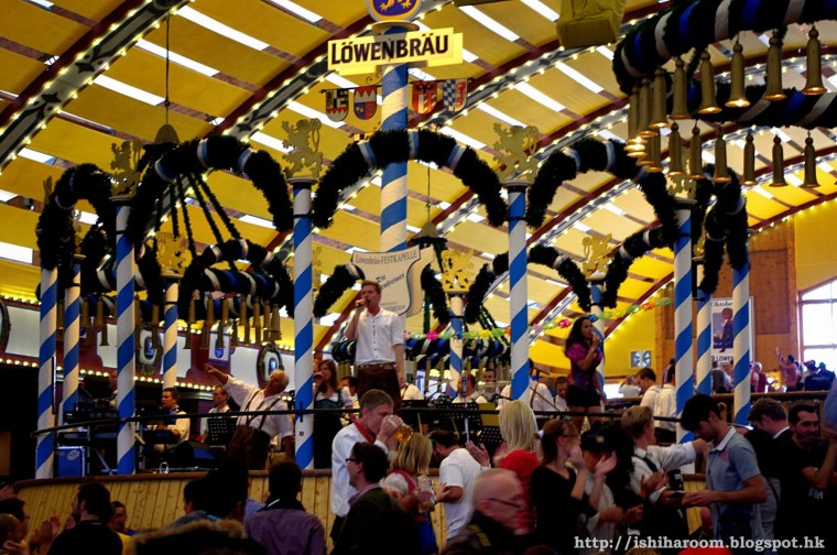 見個呢個品牌icon獅子, 就知去左Lowenbrau呢位男仕有少少似Mr BeansSchottenhamel tent! 呢個入到去同Lowenbrau有點相似.其實個個tent都有自家特色, 也有自家的live band, 有時會因應當場氣氛彈奏唔同的音樂.  啤酒節個人覺得超好玩, 冇做reservation的話, 就要找個下午的時間去碰下運氣啦!! 有d tent唔只有室內tent, 仲有室外座位.  注意有d tent入去前要檢查你的手袋, 見你有飲品會叫你棄置.  如果唔係唔比你入內.