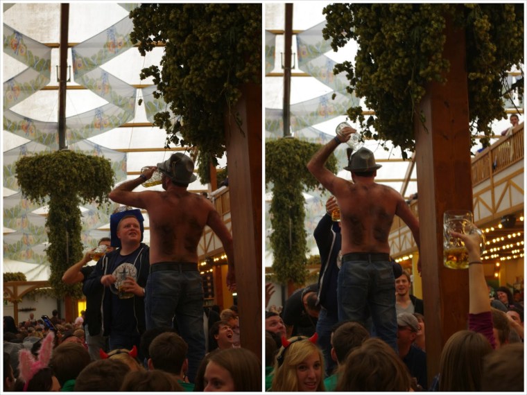 呢個tent都算好玩, 因為有好多人不停乾杯.「Prost!」是德文的乾杯,說的時候要有男子氣概,聲音要低沈,然後用自己的一公升啤酒杯用力跟別人碰杯暢飲.  Live band每隔一小段時間就會演奏Eon Prosit,提醒大家,飲酒啦!