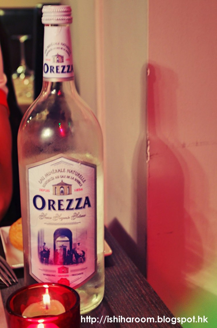 我地點了枝Orezza sparkling water & 一杯White wine.  好多餐廳都有Orezza.  雖然話 Slightly sparkling, pleasant to drink without any medicinal aftertaste.  但我自己覺得幾strong, 唔飲慣可以覺得有少少辣喉.  呢枝Orezza 話有助消化的呢!!  因為呢間餐廳比較黑, 所以影出來的相真係唔多靚.  其實賣相係好ok架.