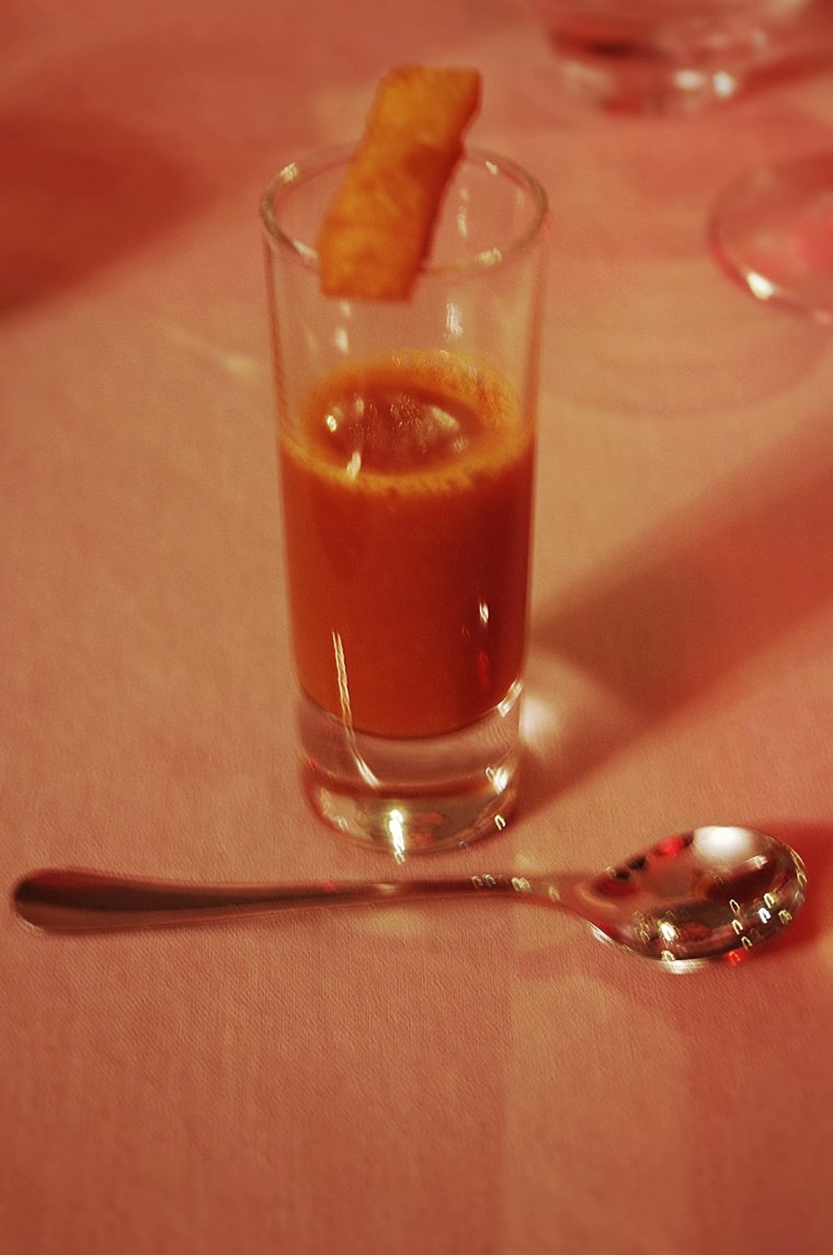 呢間餐廳的麵包都係自己做的, 我地食完一round, waiter又問我地要唔要多round.  我地兩個食食下都食左幾款麵包.  印象記得香草麵包好好味.  到湯來的時候, waiter再問, 我地已經冇再要啦!! 因為要留肚吃正餐.    湯係南法獨有的馬賽魚湯, 好濃好香呢!!