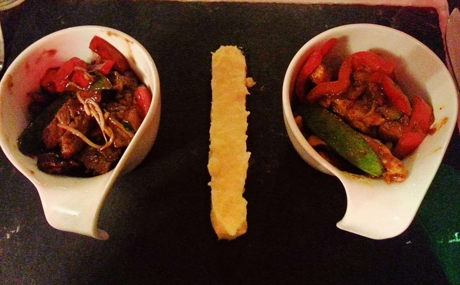 Main course: 我點了一個係兩食的牛肉及雞肉伴薯蓉.  上菜的黑碟係塊石板.  味道比較濃, 帶點辣.