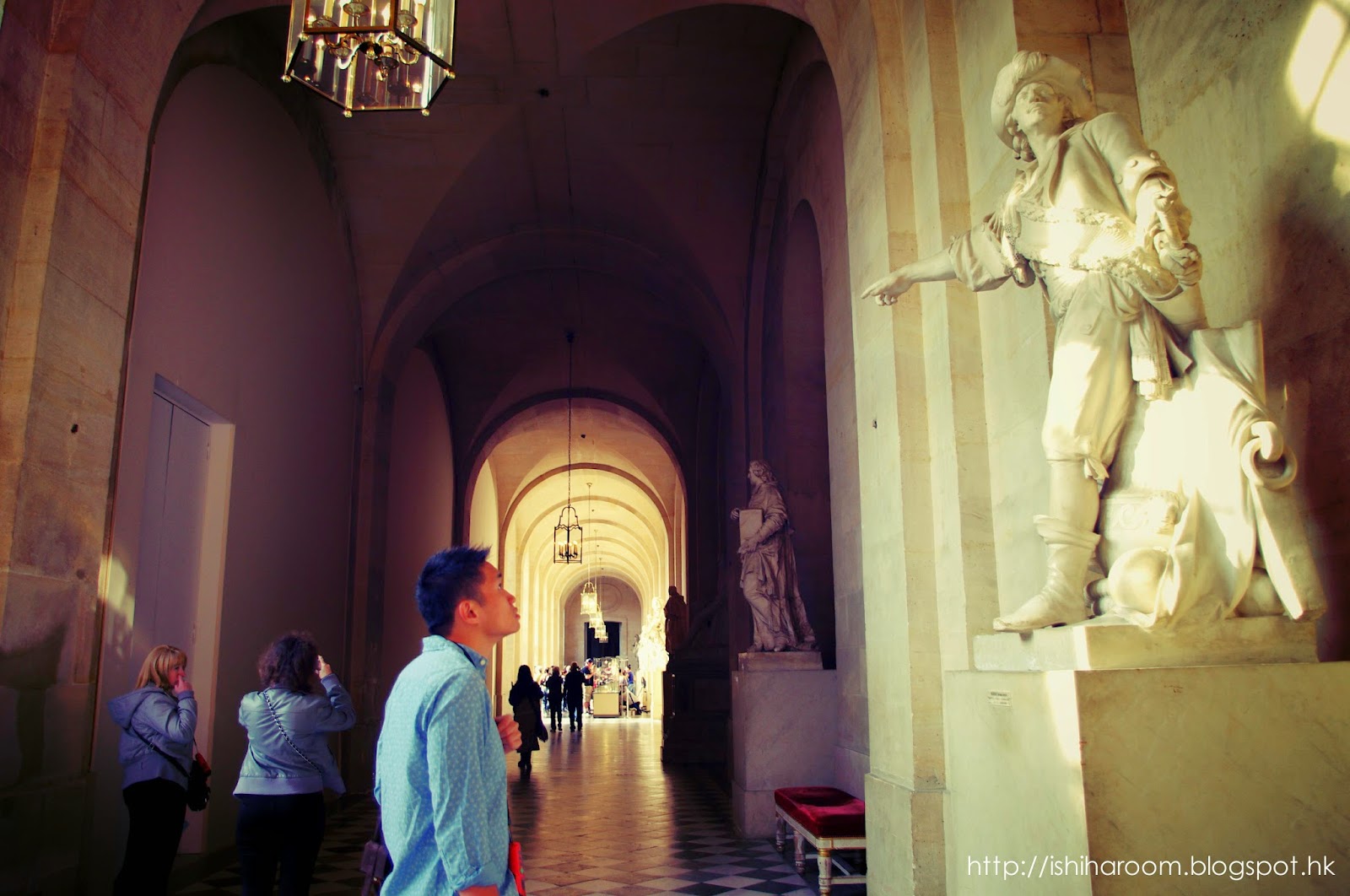 凡爾賽宮可免費借用語音導覽, 最好自備headphone. 吉少隨身有一對headphone, 所以比左我用. 佢自己找拎住個導覽聽. 沿著指標與導覽慢慢行, 每到一個展廳, 導覽器會自動撥放對應的說明.