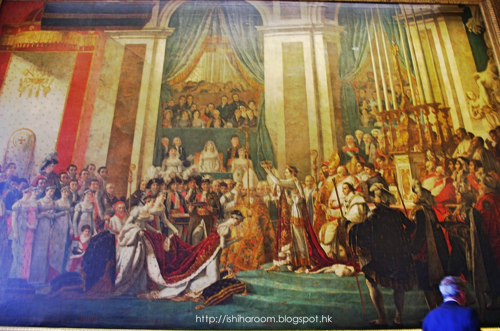最後係大名鼎鼎的畫作: 拿破崙一世加冕大典, 由大衛於1808~1822間複製重畫. 這幅畫有兩個版本, 第一版收藏於羅浮宮, 第二版則放在凡爾賽宮, 兩幅都是真品. 唯一的差別是拿破崙的妹妹寶琳公主的衣服, 從第一版的白色變成粉紅色