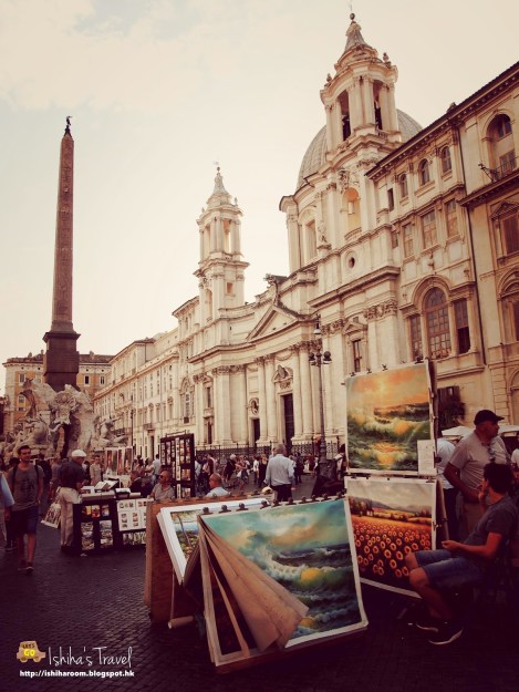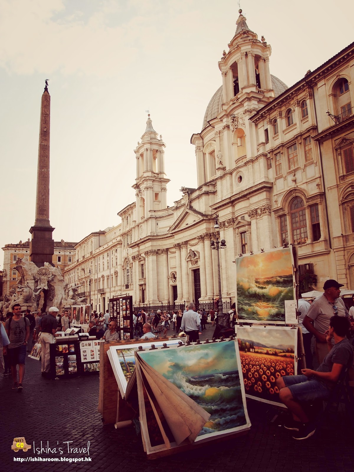 始建於公元1 世紀, 是古羅馬圖密善的競技場, 廣場中央座落了3 座噴泉, 當中最有名的四河噴泉與廣場的古埃及方尖碑互相輝映.   廣場上好熱鬧, 而且有好多小販畫檔.