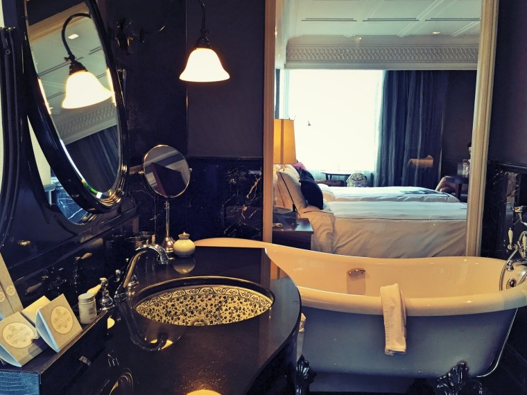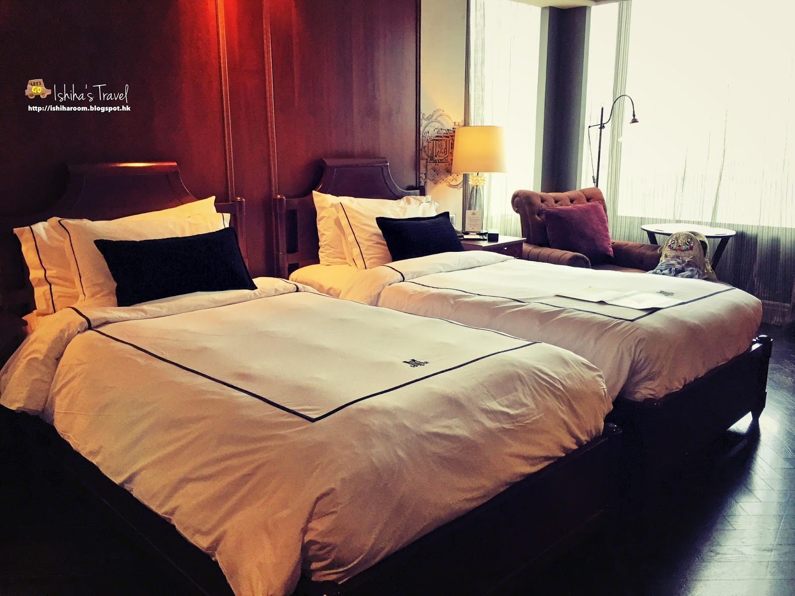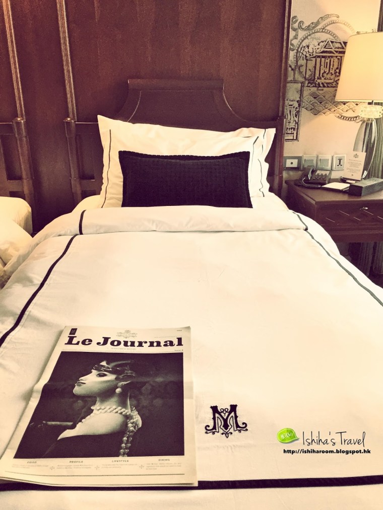我地4人同行, 分別訂左兩間房.   好啦!! 上房了…..我地兩間房既setting有少少唔同, 不過大致相同.  我住那間房內既浴室採用透明大玻璃, 用既時候全部放下電簾, 超方便.    最愛浴室既貴妃浴, 夜晚行到倦來個浸浴真係超爽. 床也是超大張, 而且好舒服床上放有自家製介紹 , 用上報紙型式, 唔錯既design