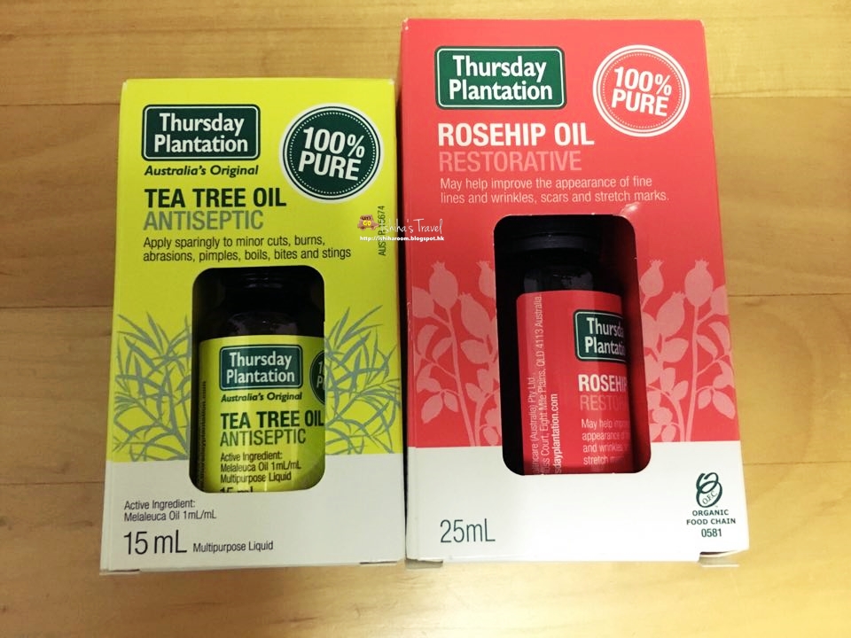 Thursday Plantation茶樹油100% Pure, 價錢平而且好用. 一枝AUD$4.99. 建議稀釋後再搽上身使用. 消腫很有效. Thursday Plantation產品好多, 另外Rosehip Oil 玫瑰果油好好用. 可以改善暗沉及疲倦的肌膚及補充乾燥肌膚水分, 改善乾燥及敏感性的肌膚, 減輕因為過度曝曬而脫水的狀況. Rosehip Oil大概一枝都係AUD$15.