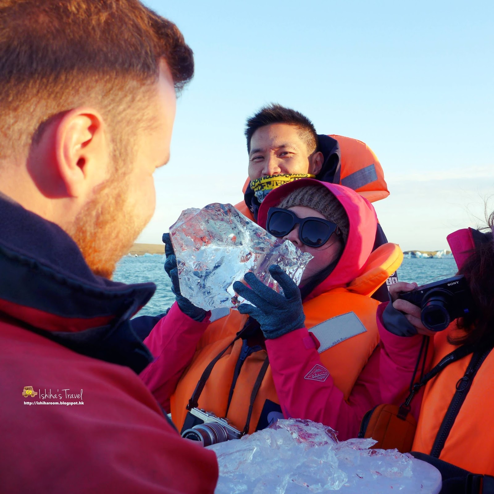 好大舊既浮冰呢!! 係海面見到既只是冰山一角.  湖下面有更大既浮冰.  整個Trip船員會講解冰河湖既形成, 而且湖內有魚呢!!  本來就係想坐呢隻橡皮艇, 好可惜冇機會!! 呢家見到工作人員坐係橡皮艇上, 其實係拾左兩舊冰交比船員作講解.