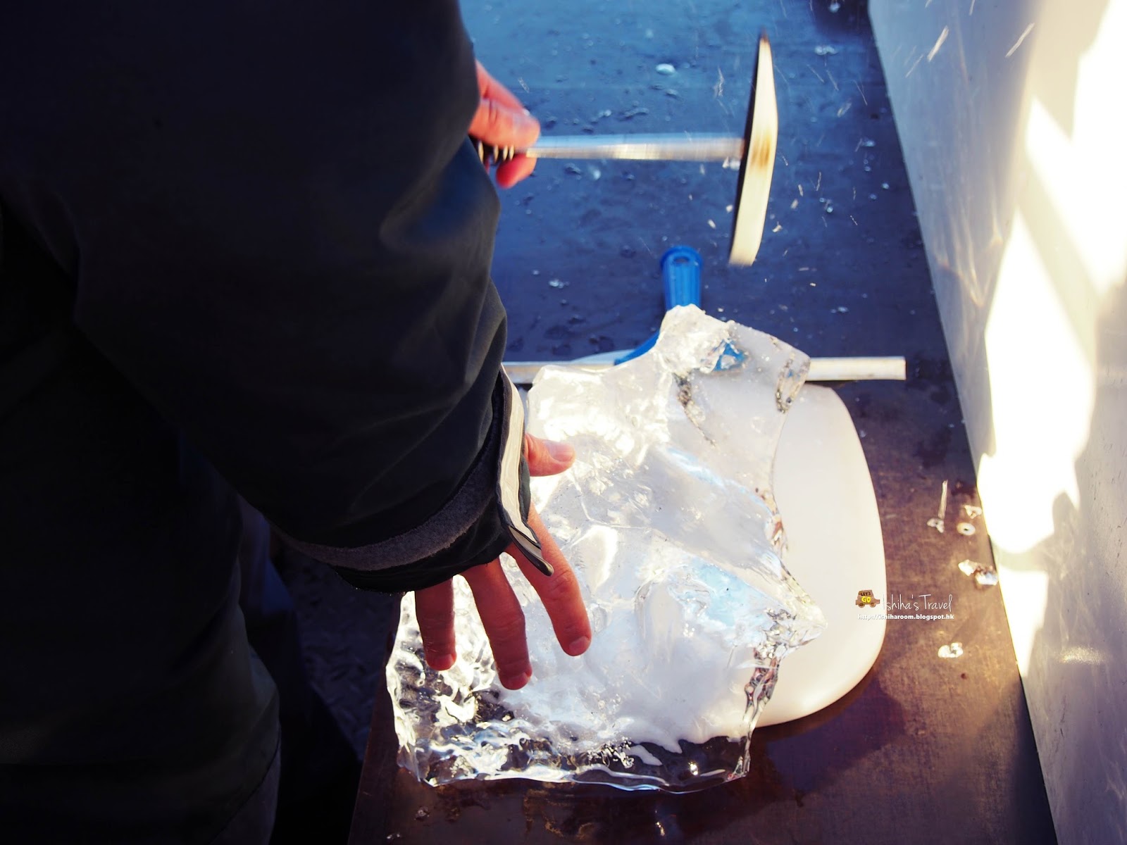 船員收到兩舊冰之後, 叫大家睇下邊舊係屬於冰川既浮冰或是海上既冰. 答案係冰川出來既浮冰係冇氣泡, 所以好容易分別到.  船員仲鋤碎冰川浮冰給大家試用.
