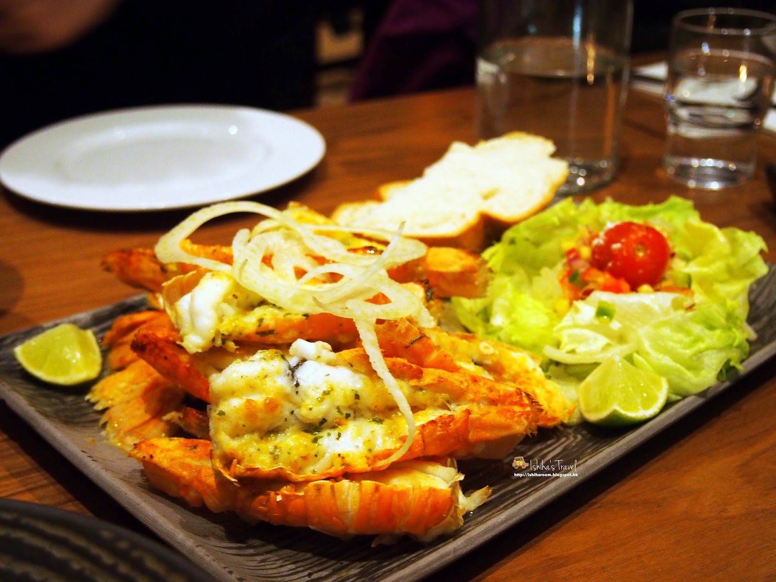 . 好彩有免費Wifi打發下時間, 仲可以打下卡同親愛既朋友傾下計呢!! 主菜終於上枱啦!! 先到的是烤小龍蝦, 配有麵包及蔬菜. 一碟烤龍蝦有十多隻, 雖然小龍蝦也算新鮮, 但味道唔太突出. 跟我地前晚吃既小龍蝦類同, 不過呢個係烤囉.