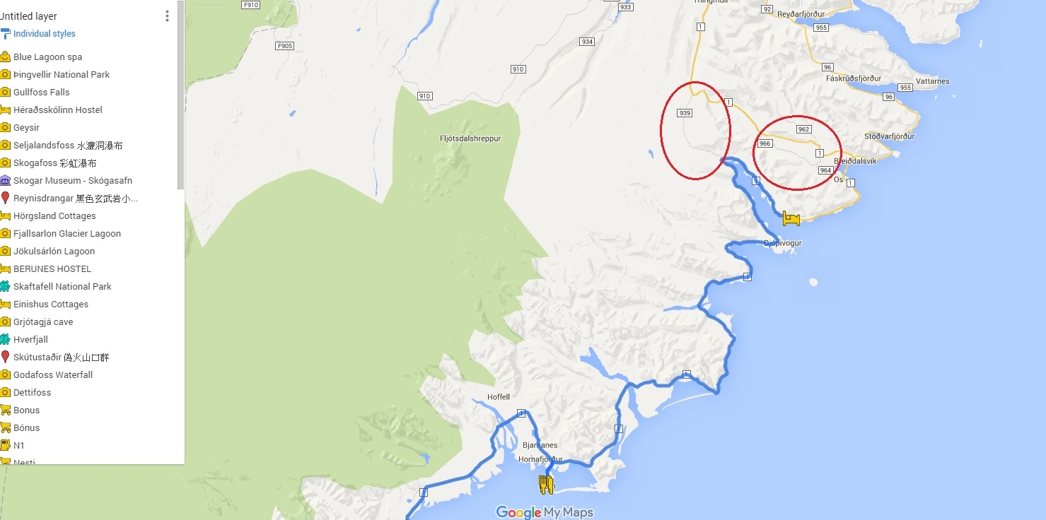 埋單大約28000 ISK, 大約HK$1700多4個人. 以冰島既物價指數來講, 呢餐唔算貴啦!! 食飽後, 我要揸兩個小時車去今晚既住宿. 點解會揀住咁遠呢?? 有兩個大原因. 第一唔想明天揸車太辛苦, 寧願今晚揸左一半路程, 明天去米湖那段車程可以短D. 第二個原因係我要避行939呢條公路 (即下圖左邊紅圈位置), 而我今晚既住宿係Ring Road一號公路上, 唔會怕天黑被GPS帶左入去行939. 939公路有好多人都講過佢係有幾超難度, 唔只路窄, 而且路全是山崖邊. 行行下想調頭都唔駛點諗啦!! 如果唔好天, 危險指數也會相計提升. 聽完都驚, 何妨我更要摸黑駕駛呢!!