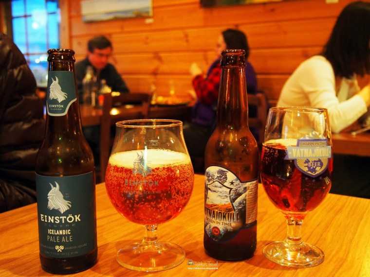 來到剛好是1945, 去到餐廳經已滿座. 好好彩我地都係等左5分鐘就位啦!! 估唔到係冰島, 夜生活唔多既地方, 最見得多人既地方就係龍蝦餐廳啦!! 一坐低Waiter問我地飲咩. 既然今日超額完成, 當然大家要啤一啤!! 每人點了枝Beer. 之後睇睇餐牌, 大家點菜都以龍蝦為主. 餐廳內有提供免費Wifi, 不過只限30分鐘. Kaffi Hornið 內提供既Beer都有幾款, 我地大家點左唔同款試, 味道都唔錯呵.