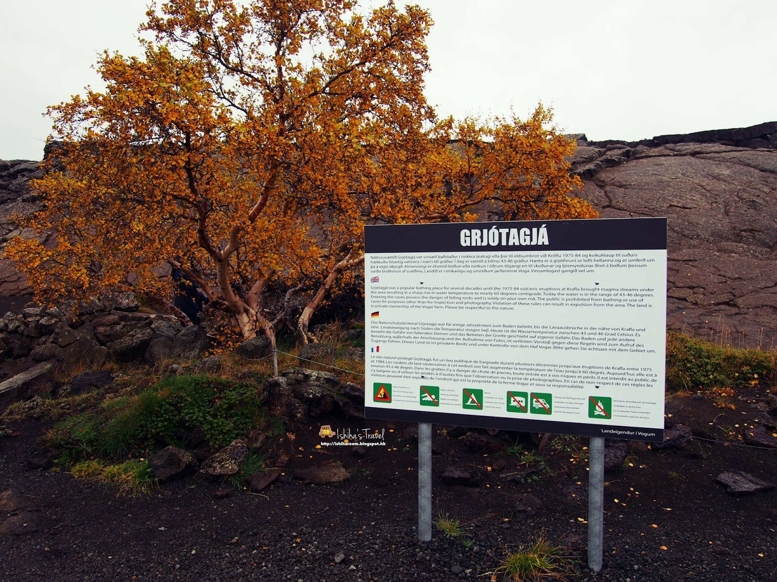 第二日起身, 去左 Grjótagjá洞穴溫泉. 呢個洞穴溫泉係全天然. 數十年前火山爆發, 洞內泉水水溫升高至60度, 當時既人會去洞穴溫泉裹浸泡. 不過現在水溫已下降到43度. Grjótagjá洞穴溫泉個入口就係棵樹既後面.